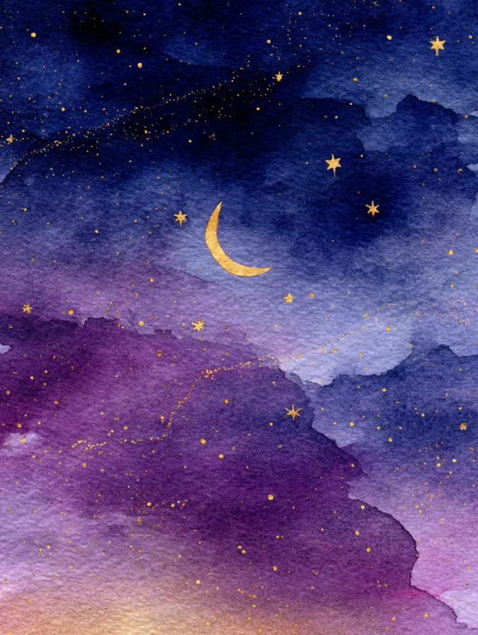 This painting captures a dreamy night sky filled with deep indigo purples and soft lavender washes layered together like drifting clouds. A delicate golden crescent moon floats near the center, surrounded by tiny scattered stars that add just enough sparkle without overwhelming the scene. The brush strokes stay loose and textured, letting the watercolor flow naturally while keeping the overall composition simple and balanced.