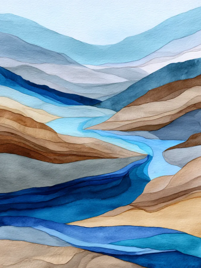 This painting shows a gentle river flowing through layered hills and valleys, all built from soft organic shapes and calming color blocks. Cool blues guide the eye through the center, while muted browns beiges and soft grays stack around it to create depth without heavy detail. The watercolor washes blend smoothly, giving the whole scene a clean modern look that still feels natural and relaxed.