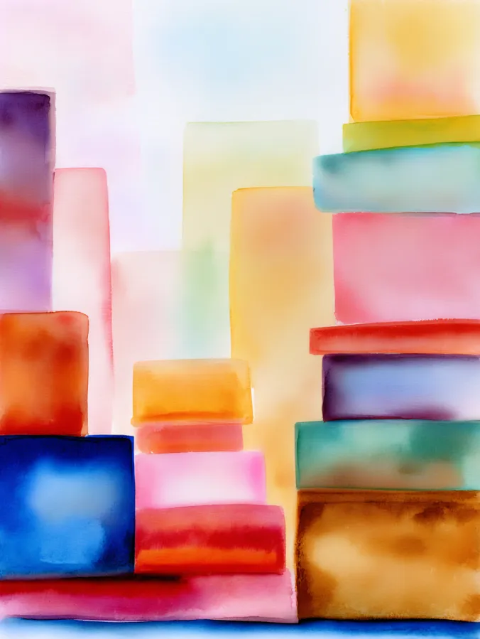 This painting is made up of stacked rectangular shapes in soft translucent watercolor washes, using a playful mix of pinks blues yellows greens and warm neutrals. The edges are slightly blurred and imperfect, letting the colors bleed gently into one another while still keeping each block distinct. The composition feels balanced but relaxed, with plenty of light space that keeps everything looking modern and minimal.
