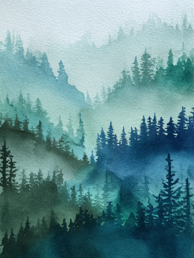 This painting shows a peaceful forest scene built from soft layers of pine trees fading into the distance. Cool greens teals and deep blues blend together with misty washes that create a foggy almost dreamlike effect. The trees are simple silhouettes with loose edges, and the overlapping layers give depth while keeping the overall composition calm and uncluttered.