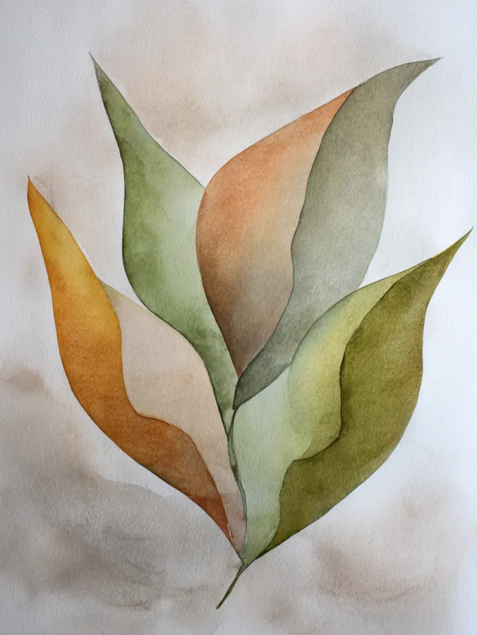 This painting shows a small cluster of elongated leaves painted in soft earthy greens muted olives and warm golden browns. Each leaf has gentle color variation and slightly uneven edges that give it that relaxed watercolor look. The composition stays clean and centered with plenty of open space around the leaves, which keeps everything feeling light airy and beautifully minimal.