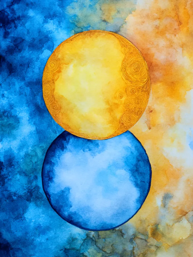 This painting features two stacked circles that feel perfectly calm and intentional, with a warm golden sun resting above a cool blue water form. The background blends softly from rich blues into glowing yellows, creating a gentle contrast without feeling busy. Subtle spiral textures inside the sun add quiet interest, while the watercolor washes stay loose and organic, keeping the overall layout clean, centered, and minimal.