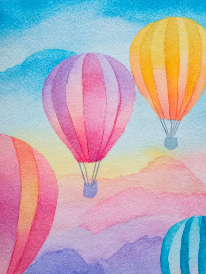 This watercolor painting features a cluster of floating hot air balloons drifting across a gentle sky filled with blended blues, pinks, and warm golden tones. The balloons are painted with simple rounded shapes and vertical color bands that softly bleed into each other, creating that classic watercolor glow. Loose brush strokes and visible paper texture give the whole piece an airy handmade feel, while the layered hills in the background add just enough depth to keep the scene visually interesting without feeling busy.