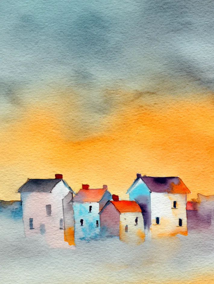 This watercolor painting shows a small row of charming houses clustered together under a warm glowing sky. Soft washes of golden yellow and muted orange fill the background, gently fading into cooler blue gray tones above. The houses are painted with simple blocky shapes and loose edges, using pale blues whites and warm roof colors that softly blend into the misty ground below. Brush strokes stay relaxed and slightly uneven, letting the paper texture show through and giving the whole scene a dreamy handmade look.