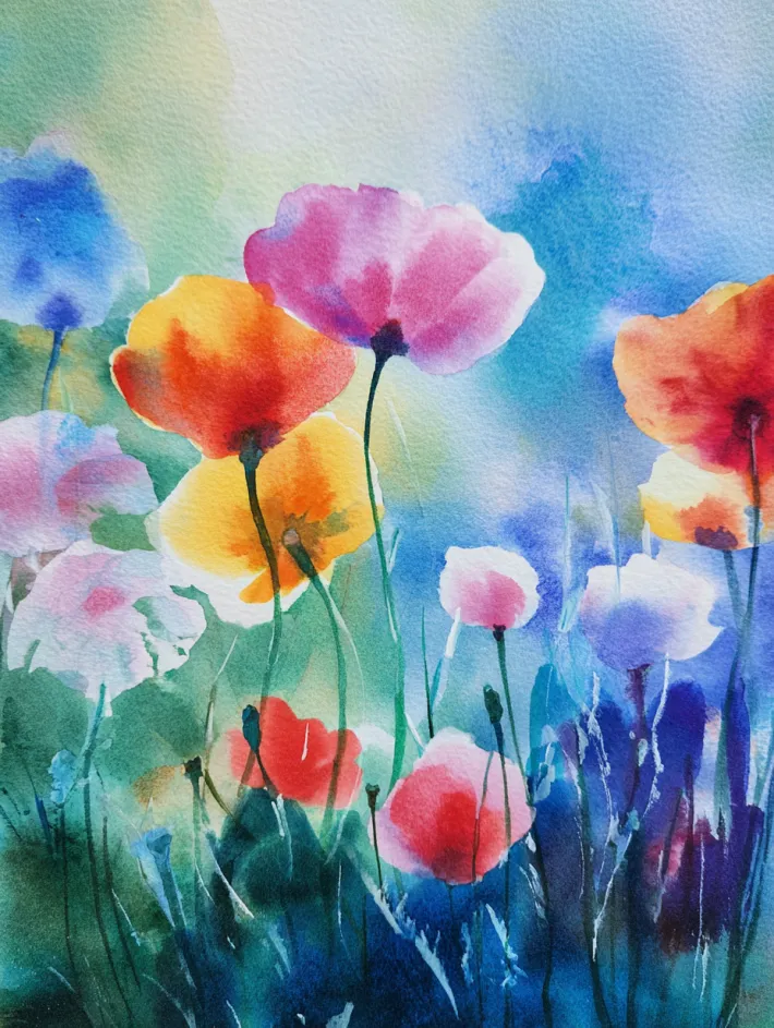 This watercolor painting shows a joyful mix of tall wildflowers painted with soft flowing brush strokes and vibrant splashes of color. Pinks oranges yellows and hints of purple bloom against a cool blue and green background, creating a beautiful contrast that feels fresh and lively. The flowers are simple in shape with rounded petals and thin stems, while the background stays loose and blended, letting the watercolor bleed naturally and add depth without sharp details.