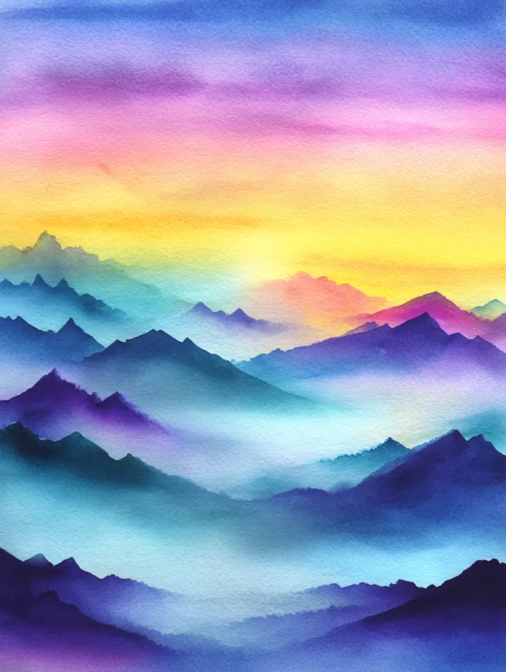This watercolor painting features soft layers of mountain silhouettes fading into the distance under a glowing sunrise sky. The colors move beautifully from deep blues and purples in the foreground to lighter aqua and lavender tones, with warm yellows and pinks shining through the sky above. Each mountain layer is painted with simple flowing shapes and gentle edges, creating depth through color rather than detail. The overall composition feels spacious and calm, with misty areas blending the layers together in a very soothing way.