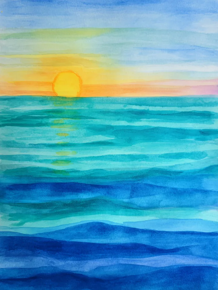 This watercolor painting shows a peaceful ocean scene with the sun sitting low on the horizon, glowing in warm yellow and soft orange tones. The sky fades gently into pale blues, while the water below is painted in layered bands of turquoise, teal, and deep blue. Loose horizontal brush strokes suggest calm rolling waves, and the reflection of the sun stretches softly across the water. The composition feels open and balanced, with simple shapes and smooth color transitions that keep the scene calm and uncluttered.