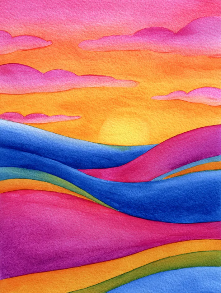 This watercolor painting features flowing layers of rolling hills painted in bold pinks blues greens and warm golden tones. The sky glows with soft orange and peach hues, dotted with simple rounded clouds that keep the scene playful and light. Each hill is created with smooth curved brush strokes that overlap gently, giving the composition movement without feeling busy. The colors stay vibrant yet blended, letting the watercolor texture and paper grain add a soft handmade finish.