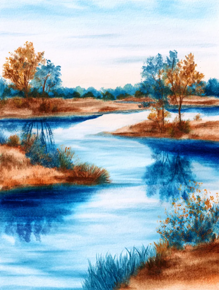 This watercolor painting shows a peaceful river winding through a soft natural landscape, surrounded by trees and grassy banks in warm earthy tones. Cool blues fill the water, reflecting the sky and nearby trees with loose vertical brush strokes that feel gentle and fluid. The background stays light and airy, while the foreground adds depth with richer color and texture. The overall layout feels open and balanced, with the river naturally guiding the eye through the scene.