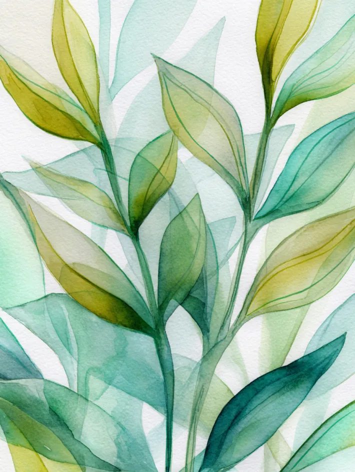 This watercolor painting features delicate leafy stems painted in overlapping layers of soft green teal and muted olive tones. The leaves are long and simple with gently curved shapes and thin flowing stems that cross naturally through the composition. Brush strokes are light and translucent, allowing colors to overlap and create subtle depth without heavy detail. The background stays airy and pale, letting the leaves feel fresh and weightless while the paper texture adds a calm organic finish.