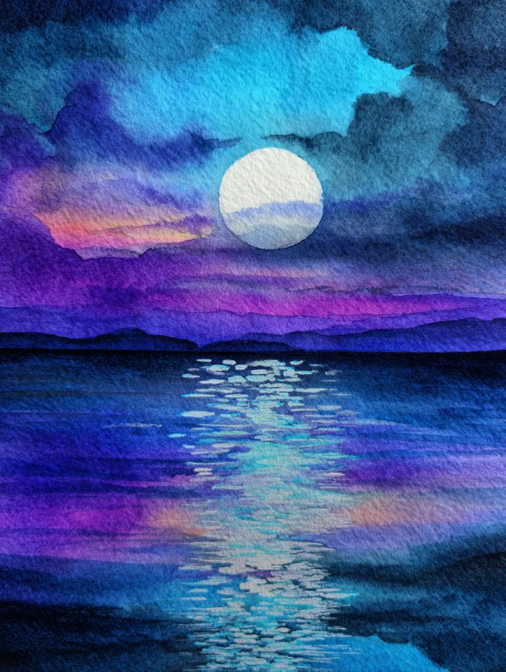 This watercolor painting features a bright full moon resting above a deep blue and purple night sky, casting a shimmering reflection across still water below. Layers of indigo violet and soft turquoise blend together with loose horizontal brush strokes, creating a rich moody atmosphere. The reflection is painted with broken lighter strokes that feel natural and fluid, while the distant shoreline stays dark and minimal. The composition feels balanced and peaceful, with the moon acting as a soft focal point that draws the eye without overpowering the scene.
