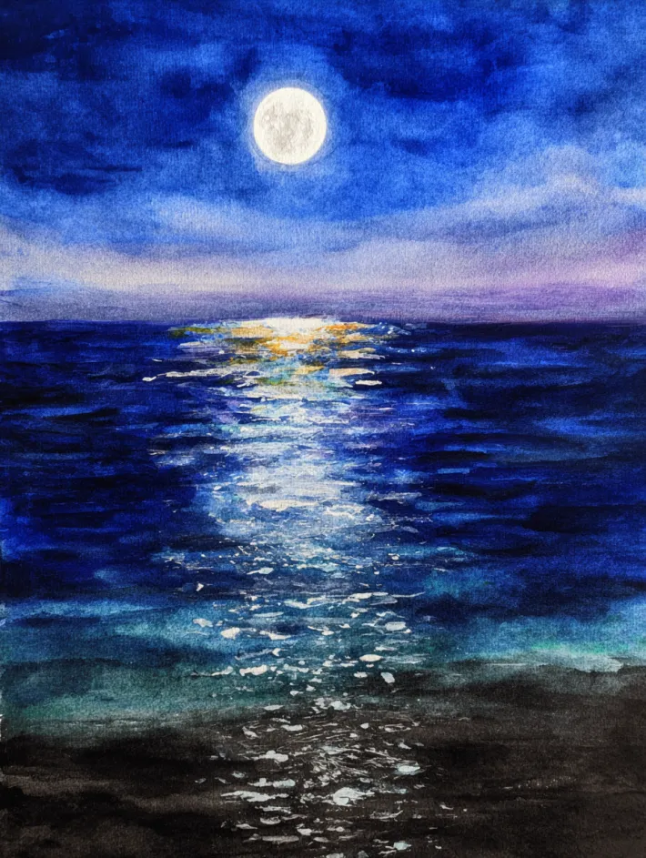 I love painting moonlit scenes like this because they feel calm and a little magical. Working with darker colors is surprisingly relaxing, and adding the reflection at the end is always my favorite part. I do not have to worry about perfect lines since loose brush work actually makes the water look more realistic. It is the kind of painting that feels soothing to create and leaves me feeling cozy and accomplished once it is finished.