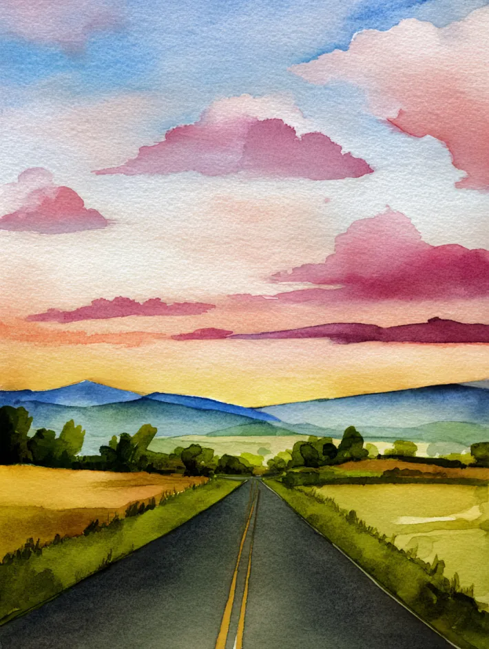 This watercolor painting shows a long quiet road stretching into the distance, framed by soft fields and rolling hills under a colorful sunset sky. Warm yellows and peach tones glow near the horizon, blending gently into pinks and light blues above. The road is painted with simple clean lines that guide the eye forward, while the surrounding greenery stays loose and textured with relaxed brush strokes. The overall layout feels open and balanced, with plenty of sky to create that peaceful end of day mood.