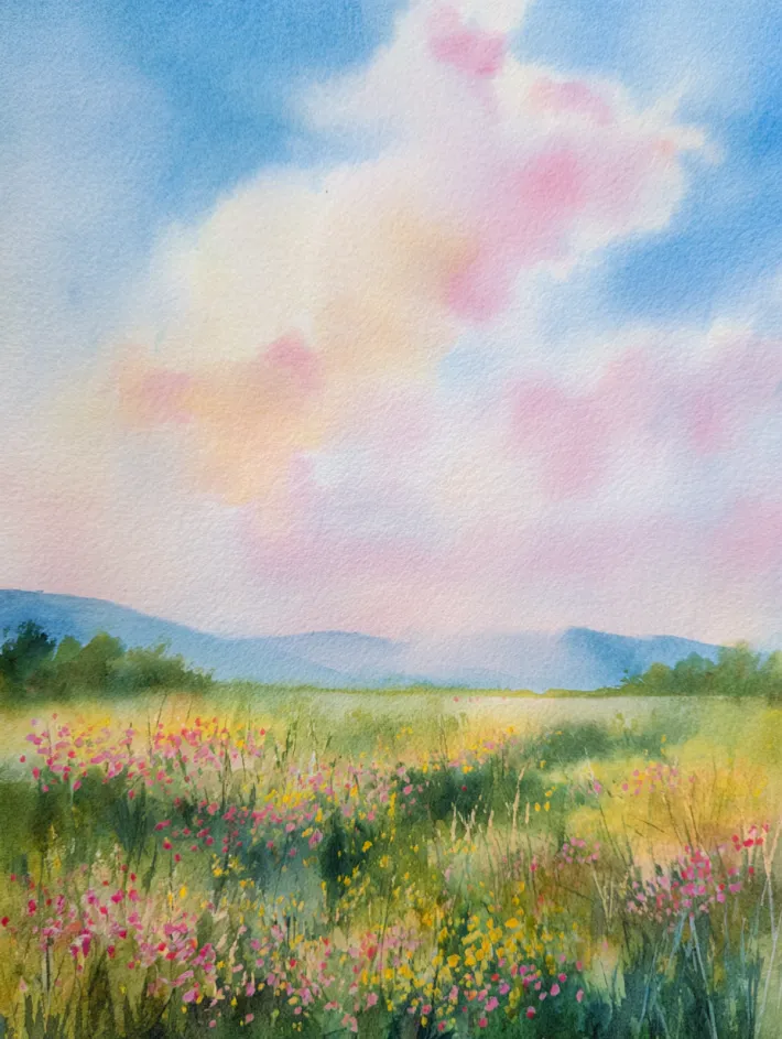 This watercolor painting shows a gentle meadow filled with loose wildflowers in soft pinks yellows and fresh greens stretching toward distant hills. The sky above is painted with airy washes of blue peach and blush tones that blend seamlessly into each other. Brush strokes stay light and flowing, especially in the field where small dots and quick marks suggest flowers without heavy detail. The composition feels open and calm, with the horizon sitting low to give the sky plenty of space to breathe.
