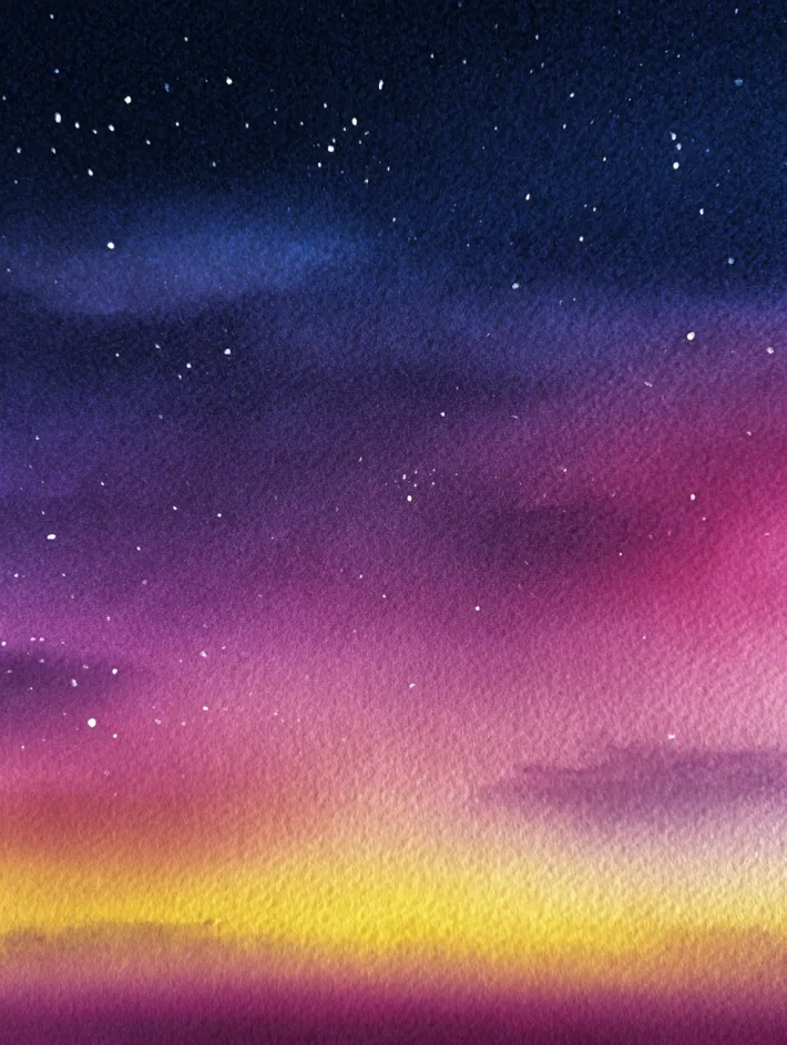 This watercolor painting focuses on a smooth gradient sky that fades from deep navy and indigo at the top into rich purples pinks and a warm golden glow near the horizon. The colors blend seamlessly with gentle horizontal washes, creating a calm dreamy transition across the page. Tiny white stars are scattered lightly throughout the sky, adding texture and interest without overpowering the softness of the background. The overall layout feels simple and spacious, letting the color blends and paper texture take center stage.