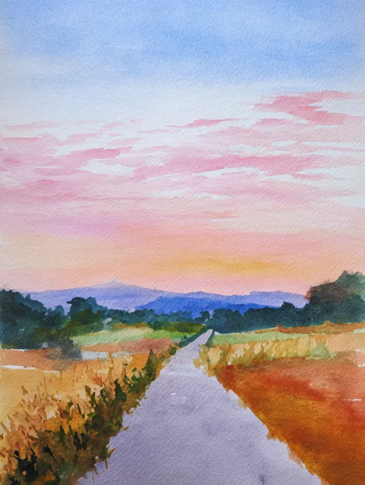 I love painting scenes like this because they feel calm and a little dreamy. The road gives the composition an easy structure, so I can relax and enjoy blending the sky without overthinking everything else. I get to play with color transitions and soft edges while keeping the details simple. It feels comforting and satisfying, like painting a quiet moment you want to linger in just a bit longer.
