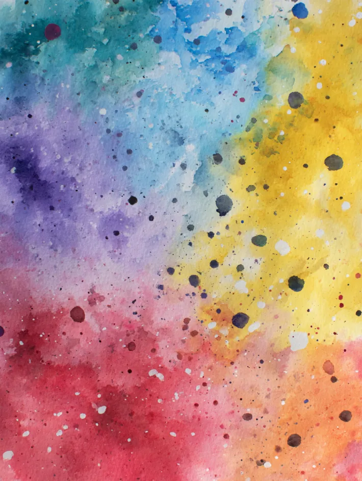 This watercolor painting is all about bold movement and joyful color. Soft washes of blue and purple blend into sunny yellows and warm reds, creating a loose flowing composition that feels spontaneous and alive. Paint splatters scatter across the surface, adding texture and playful contrast against the smooth blended areas. The brush strokes feel free and unplanned, with visible paper texture showing through and giving the whole piece that beautifully imperfect watercolor look.