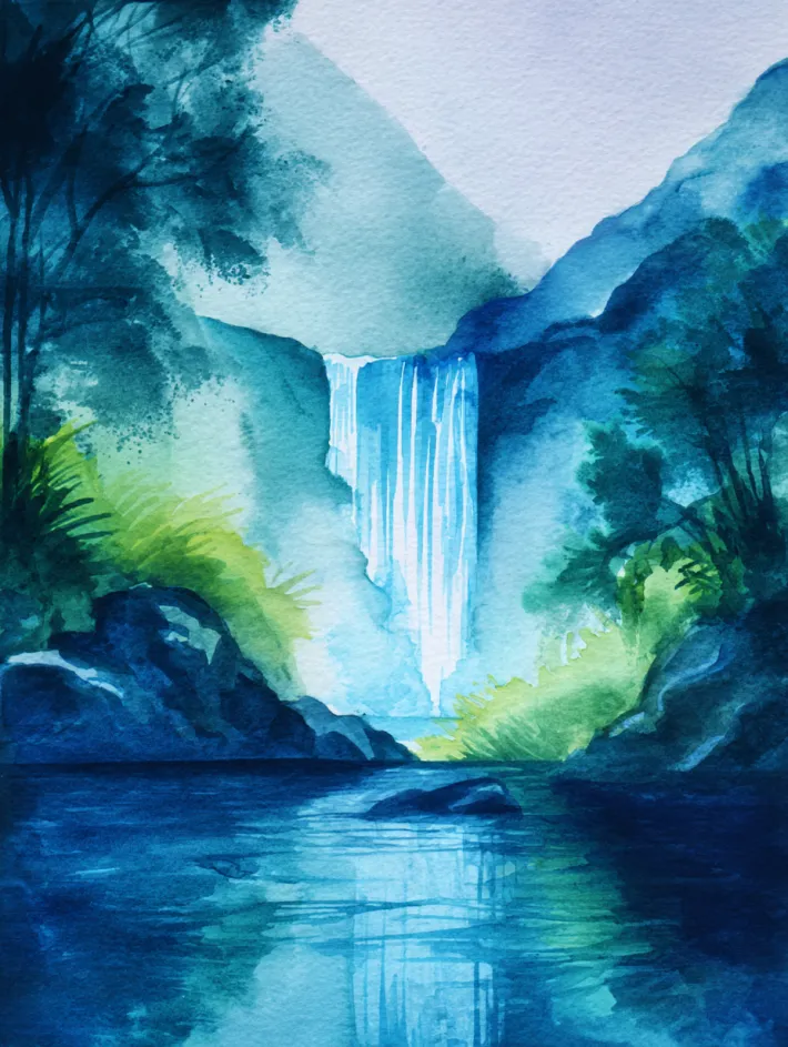 This watercolor painting shows a soft waterfall flowing between layered blue green cliffs, surrounded by loose leafy shapes and misty shadows. The colors blend beautifully from deep teal and navy into lighter aqua and fresh green tones, giving the scene a calm and cool feeling. Brush strokes are relaxed and fluid, especially in the falling water and reflections below. The composition feels balanced and open, with the waterfall as the gentle focal point and the surrounding forest softly fading into the background.