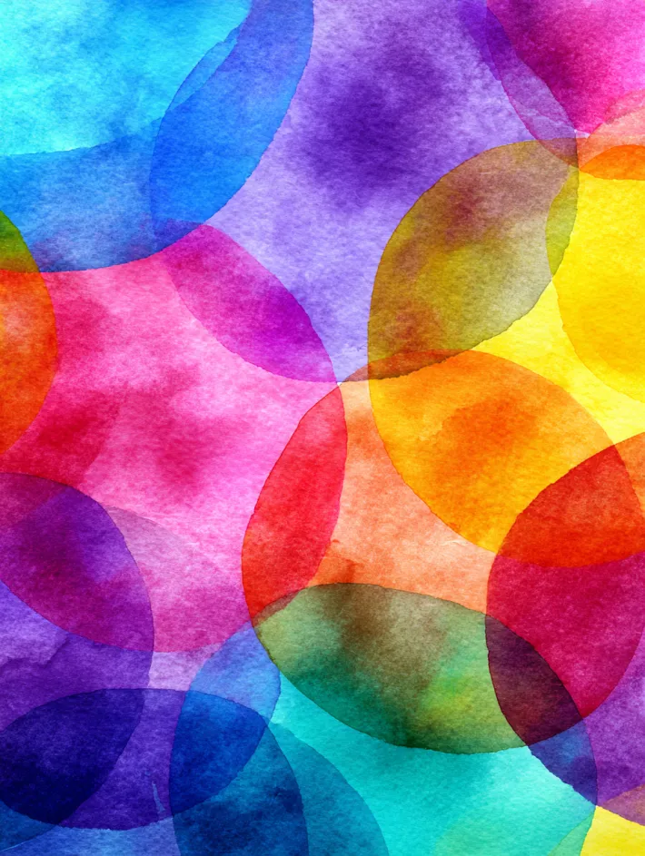 This watercolor painting features large overlapping circles layered across the page in bright pinks purples blues greens and sunny yellows. Each shape softly blends into the next, creating beautiful transparent overlaps where colors mix and glow. The brush strokes are smooth and loose with visible paper texture peeking through, giving everything that soft handmade watercolor feel. The composition fills the entire space in a playful balanced way, with no single focal point so the eye can wander and enjoy all the color interactions.