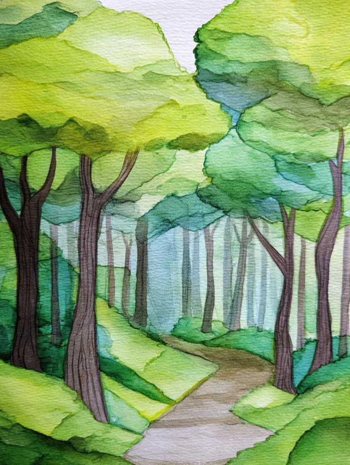 This watercolor painting shows a winding path leading through a soft green forest filled with layered trees and leafy canopies. The colors stay in a calming range of light and deep greens with hints of blue in the distance, creating a peaceful sense of depth. Brush strokes are loose and slightly uneven, letting the watercolor bleed naturally between shapes. Tree trunks are simple and slightly textured, while the background fades softly to suggest more trees beyond without adding clutter.