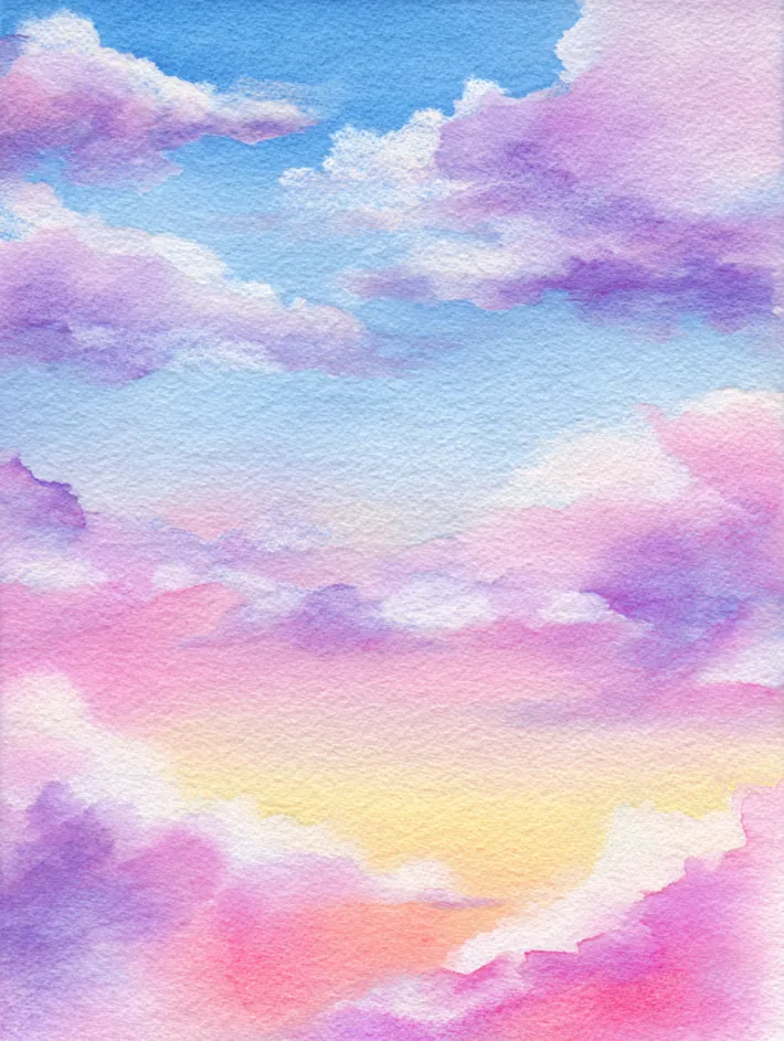 This watercolor painting focuses on a dreamy sky filled with fluffy clouds painted in gentle layers of pink purple blue and warm yellow. The colors blend smoothly into one another with soft brush strokes that create a light airy feeling across the entire page. There are no harsh lines, just flowing shapes and subtle transitions that let the watercolor texture shine through. The composition feels open and calming, with the clouds drifting naturally and filling the space without feeling crowded.