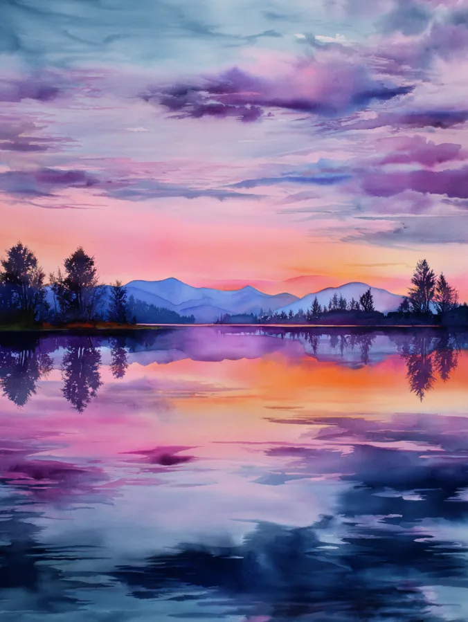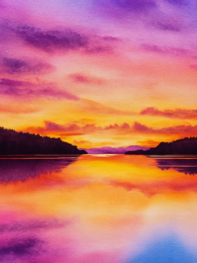 This watercolor painting captures a glowing sunset stretching across a calm lake, with rich reflections mirroring the sky almost perfectly. Warm shades of golden yellow and fiery orange melt into deep pinks and purples, while darker silhouettes of distant hills frame the water on both sides. The brush strokes are smooth and layered, especially in the sky and reflection, creating soft transitions that feel dreamy and immersive. The centered horizon line gives the composition a peaceful symmetry that instantly feels soothing to look at.