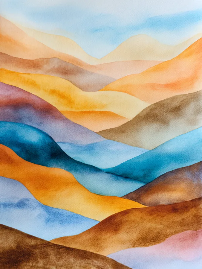 This watercolor painting features flowing layers of hills stacked gently across the page, each one painted in warm earthy shades mixed with cool accents. Soft ochre, sandy beige, muted browns, and touches of teal and sky blue blend smoothly into one another. The brush strokes are loose and watery, with soft edges that melt into the next layer. The overall layout feels rhythmic and balanced, with each hill curving naturally and creating a calm sense of movement without feeling busy.