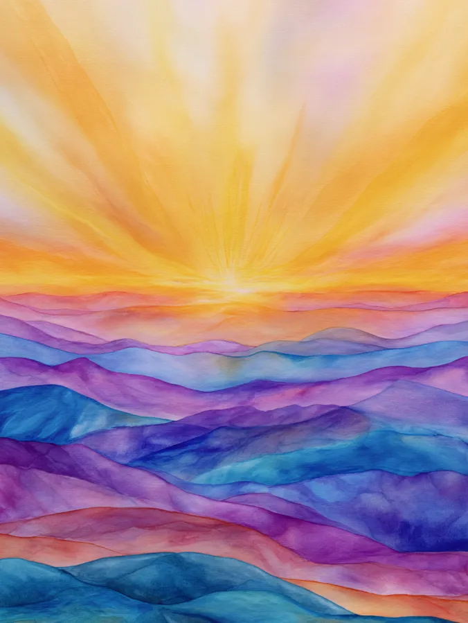 This watercolor painting features a glowing sunrise bursting over softly layered hills that stretch across the page. Warm golden yellows and soft peach tones radiate outward from the horizon, fading gently into cooler purples and blues below. The brush strokes are smooth and flowing, with each hill painted in loose washes that overlap naturally and create a calming sense of depth. The upward movement of the light draws your eye to the center, giving the whole composition a peaceful and uplifting feel.