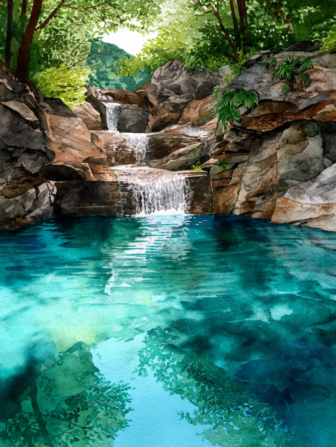 This watercolor painting shows a small waterfall flowing gently over layered rocks into a clear turquoise pool surrounded by lush greenery. Deep teals and aqua tones shimmer in the water, while warm browns and soft grays shape the rocks with natural texture. The brush strokes vary from loose washes in the water to more defined marks in the stones and leaves, creating a beautiful balance of softness and structure. The composition feels tucked away and peaceful, like a quiet forest spot you accidentally discover on a walk.