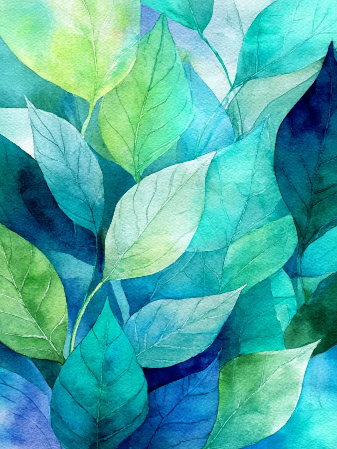 This watercolor painting features layered leaves overlapping across the entire page, creating a lush and calming botanical pattern. Cool shades of teal, emerald, mint, and soft blue blend smoothly, with subtle shifts in transparency that let each leaf stand out while still feeling connected. The brush strokes are gentle and fluid, with visible watercolor texture and soft edges that give the leaves an organic, hand painted look. The composition feels full yet balanced, making the whole piece feel fresh and soothing.
