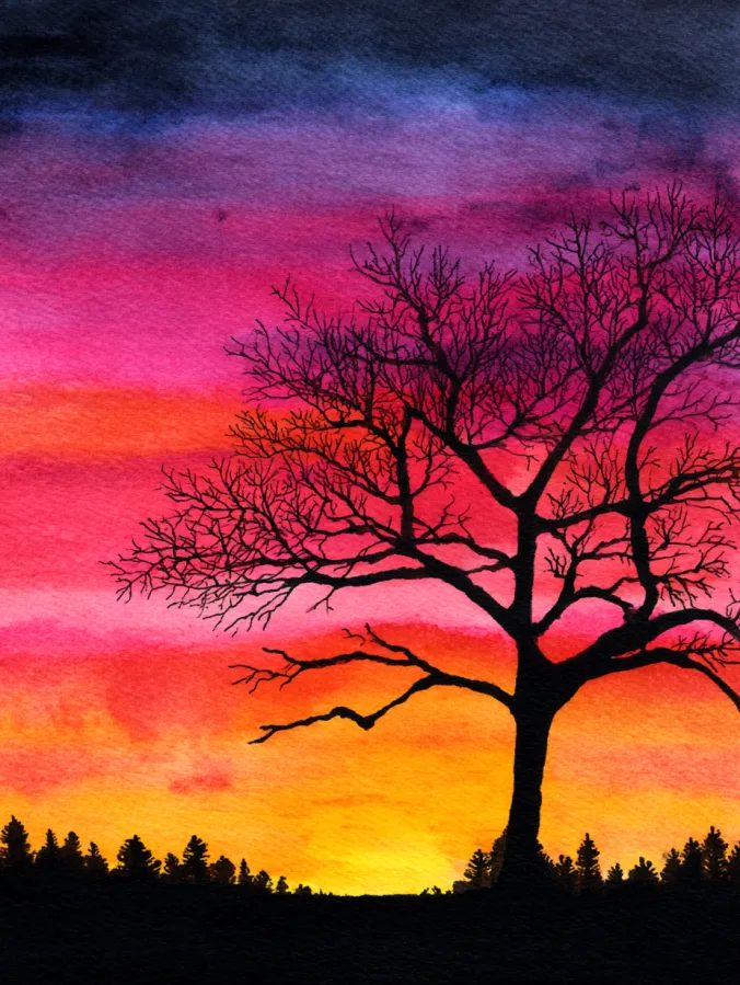This watercolor painting shows a single bare tree standing in silhouette against a richly colored sunset sky. Deep pinks, fiery oranges, and warm yellows blend smoothly across the background, fading into darker purples near the top. The tree is painted in bold dark tones with delicate branching that stands out sharply against the glowing sky. The composition feels balanced and dramatic, with the tree placed slightly off center and the horizon line grounding the scene.