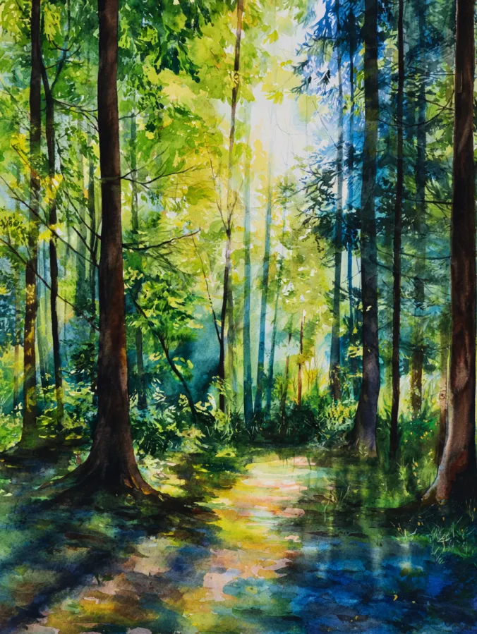 This watercolor painting captures a quiet forest scene where soft sunlight filters through tall trees and spills onto a gentle path below. Fresh greens, golden yellows, and cool blues blend beautifully, creating dappled light and shadow across the ground. The brush strokes feel loose and layered, especially in the foliage where colors overlap and softly blur together. The composition pulls your eye inward along the glowing path, making the whole scene feel peaceful and inviting.
