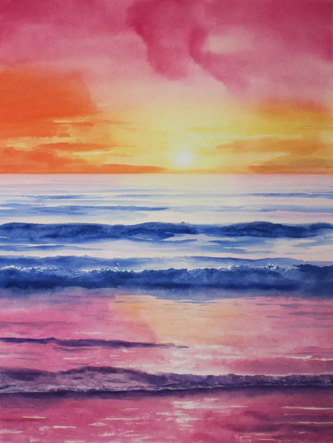 This watercolor painting shows a peaceful ocean scene with soft rolling waves layered across the page and a glowing sunset sitting right at the horizon. Warm shades of golden yellow and coral melt into rosy pinks and purples in the sky, while cool blues shape the water below. The brush strokes are loose and fluid, especially in the waves, where horizontal strokes create movement without feeling busy. The reflection of the sky in the water ties everything together and gives the whole piece a calm, dreamy balance.