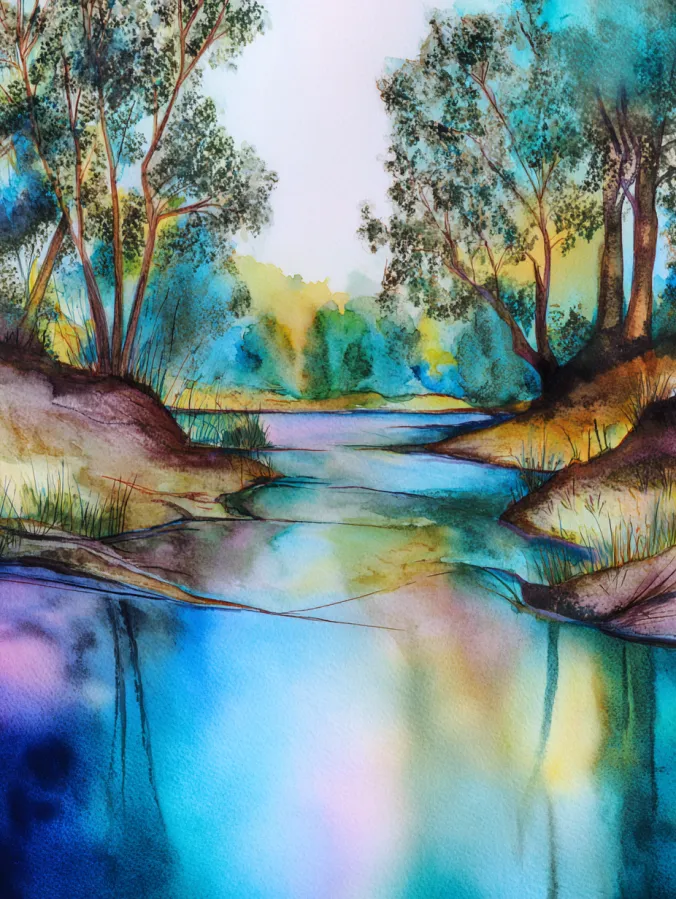 This watercolor painting shows a quiet forest creek winding gently between soft earthy banks and tall trees. Cool blues and turquoise dominate the water, reflecting hints of green, yellow, and soft purple from the surrounding landscape. The brush strokes feel loose and expressive, with flowing lines in the water and textured, organic marks in the trees. The composition naturally draws the eye toward the center where the creek narrows, creating a calm sense of depth and balance throughout the scene.