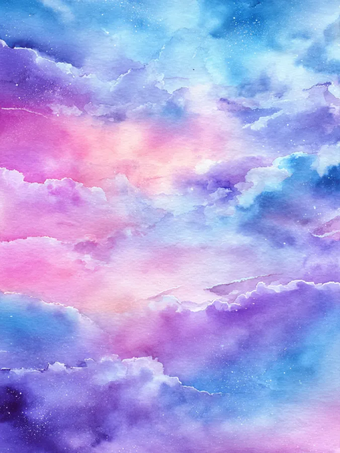 This watercolor painting features a soft sky filled with layered clouds drifting across the page in gentle motion. Blended shades of pink, lavender, periwwinkle, and sky blue melt into each other, creating a calm and airy atmosphere. The brush strokes are loose and cloud like, with soft edges and subtle texture that give the painting a floating feeling. The composition fills the entire space with flowing color, making the sky feel endless and soothing to look at.