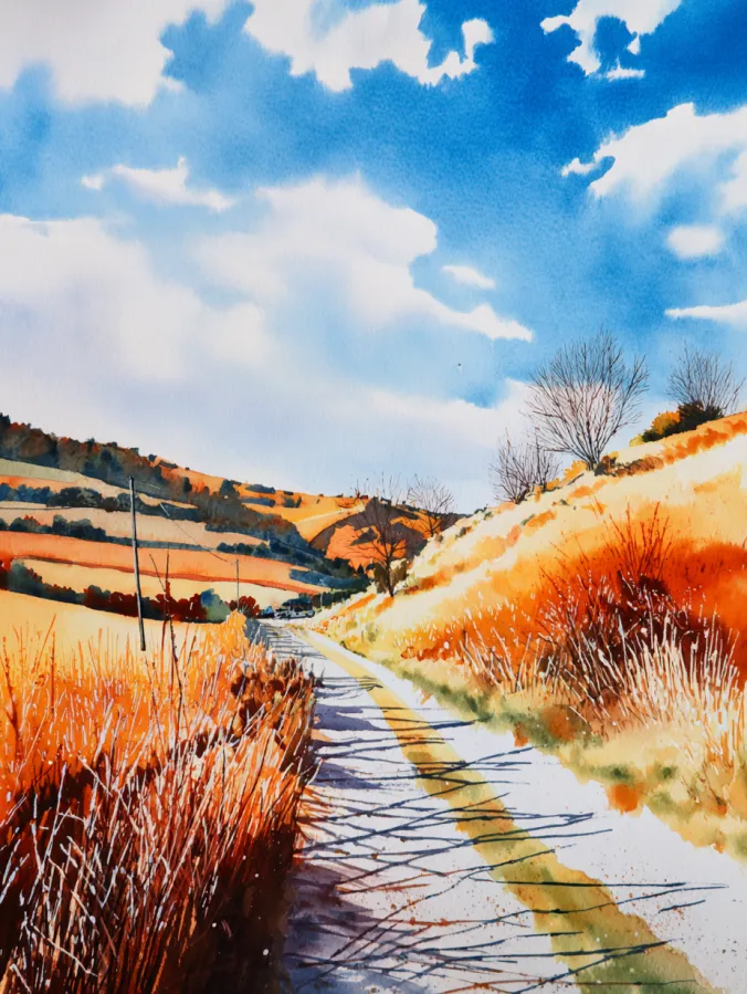 This watercolor painting shows a narrow country path winding gently through rolling hills and tall grasses. Warm golden oranges and soft browns glow along the fields, while cool blues and fresh whites shape the sky above. The brush strokes feel loose and expressive, especially in the grasses where quick flicks create texture and movement. The path leads the eye naturally into the distance, giving the whole composition an open and peaceful feeling that feels calm without being too still.