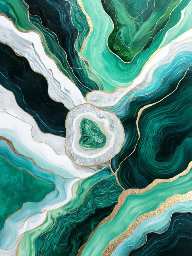 This modern acrylic painting features flowing layers of emerald green, teal, and deep forest tones that ripple across the canvas like polished stone. Smooth waves of white and pale jade weave through the composition, creating soft contrast against the darker greens. Thin lines of shimmering gold trace the edges of the shapes, giving the piece that luxurious geode inspired look. The brush strokes follow the curves of the layers, forming a fluid pattern that feels organic yet elegant. Everything radiates outward from a rounded center that resembles a crystal core, which adds structure and visual balance to the entire design.