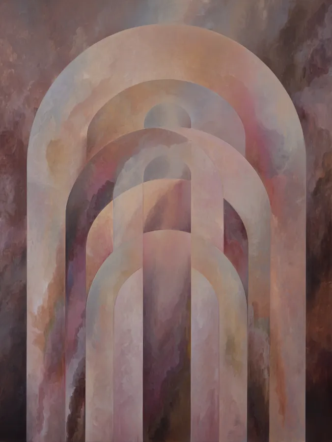 This acrylic painting features a series of tall layered arches that rise gently across the canvas in a calm symmetrical arrangement. The palette is soft and earthy with shades of blush pink, dusty mauve, warm taupe, and muted cream blending together in subtle gradients. The background has a cloudy textured effect that adds depth and atmosphere behind the smooth arch shapes. Each arch sits inside another, creating a tunnel like composition that draws the eye toward the center. The brush strokes are soft and blended, which gives the entire piece a calm polished look that feels modern yet soothing.