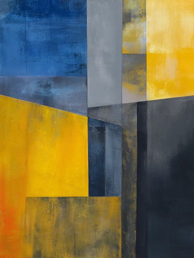 This acrylic painting features a striking geometric layout made from large intersecting blocks of color. Rich navy and cobalt blue sections contrast beautifully with vibrant mustard yellow panels, while cool gray shapes add balance throughout the composition. The forms overlap and meet at sharp angles, giving the design a modern architectural feel. Subtle texture in the paint creates a slightly weathered surface that keeps the color blocks from looking flat. The overall arrangement feels structured and confident, with each section working together to form a sleek contemporary composition.