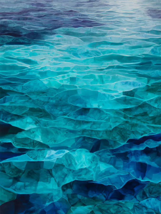 This acrylic painting captures the mesmerizing texture of layered ocean water viewed from above. Soft waves ripple across the canvas in glowing shades of turquoise, aqua, and deep sea blue. Lighter highlights trace along the tops of the waves, giving the surface a luminous effect that feels almost glassy. The brush strokes are fluid and layered, creating gentle movement as the water shifts from lighter tones near the top to deeper blues below. The composition feels calm yet dynamic, with the entire canvas filled by overlapping water patterns that mimic the rhythm of the sea.