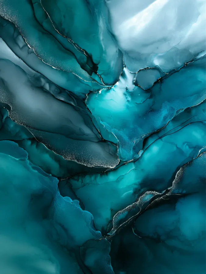 This acrylic painting features flowing layers of rich teal, deep emerald, and soft aqua that spread across the canvas like polished marble. The colors blend smoothly into one another, forming organic shapes that feel fluid and natural. Thin shimmering lines weave through the layers, adding delicate highlights that mimic the look of stone veins. Lighter areas near the center glow softly against the darker edges, which creates depth and movement across the entire composition. The result feels sleek and luxurious, with the layered textures giving the painting a refined modern look.