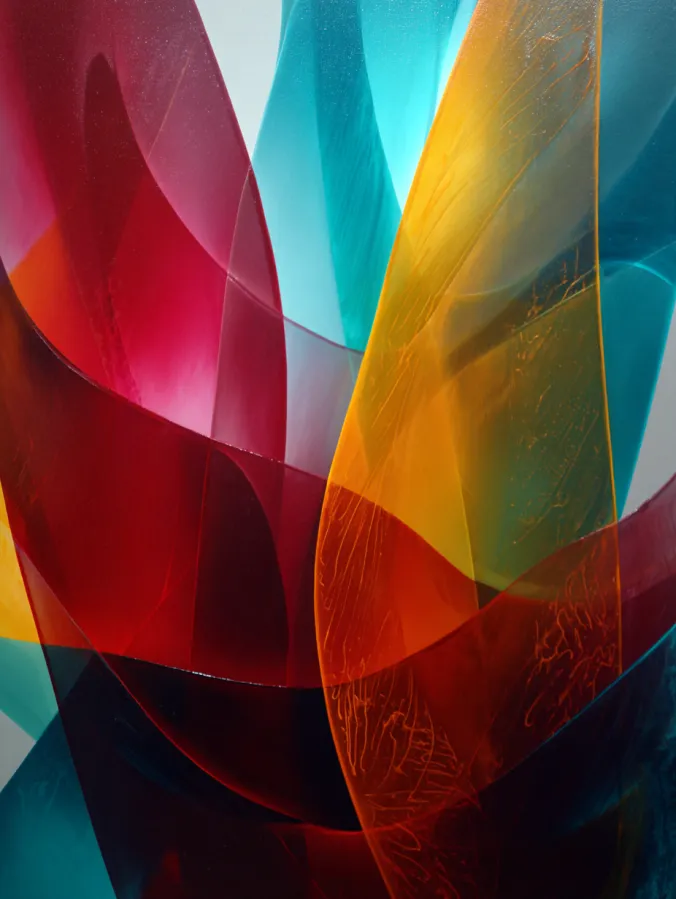 This acrylic painting features sweeping ribbon like forms that curve and fold across the canvas in a striking modern composition. Bold sections of ruby red, glowing amber, and cool teal overlap each other, creating translucent layers that feel almost glass like. The shapes twist upward with smooth flowing edges, giving the piece a sense of motion and elegance. Light reflects softly through the layered colors, while subtle textures within the brush strokes add depth to each ribbon. The overall layout feels sculptural and contemporary, with the vibrant colors creating a dramatic visual statement.