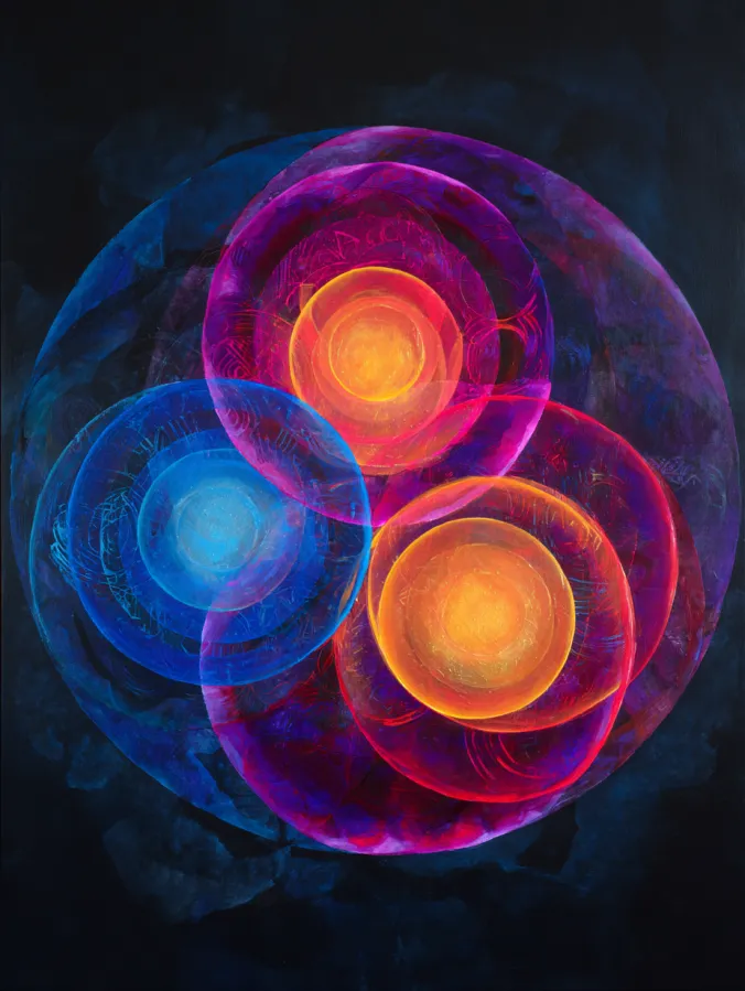This acrylic painting features a bold arrangement of overlapping circular forms that glow against a deep midnight background. Three large circles dominate the composition, each layered with vibrant colors that shift from fiery orange and golden yellow to electric pink and rich cobalt blue. The translucent edges allow the colors to blend where the shapes overlap, creating luminous rings and soft halos of light. Subtle textures swirl within each circle, adding depth while keeping the design sleek and modern. The overall layout feels balanced and energetic, with the glowing centers pulling the eye toward the heart of the composition.