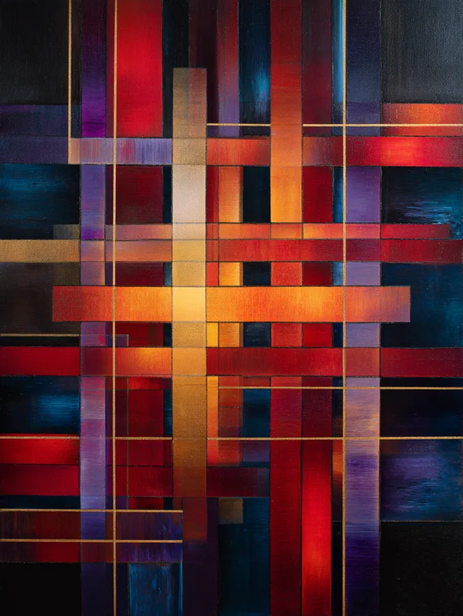 This acrylic painting features a layered grid of intersecting rectangles and lines that form a striking modern composition. Deep crimson, fiery orange, plum purple, and midnight blue blocks overlap across the canvas, creating a rich tapestry of color. Thin golden lines run vertically and horizontally through the design, adding structure and a subtle metallic glow. The brush strokes are smooth but slightly textured, giving each panel a soft painterly depth. The overall layout feels bold and architectural, with the layered shapes forming a clean yet energetic pattern that instantly catches the eye.