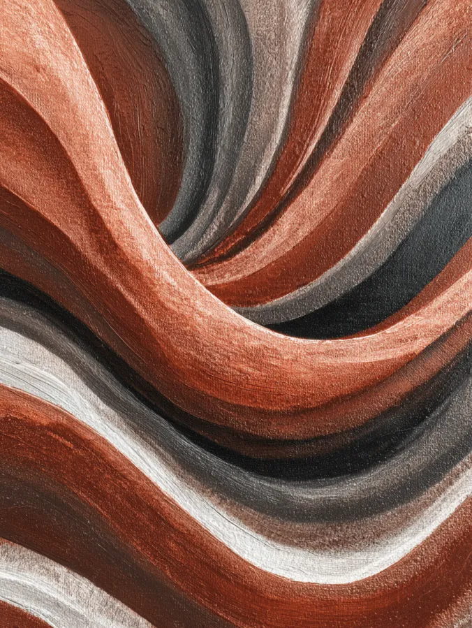 This acrylic painting features smooth flowing bands that curve gracefully across the canvas like sculpted ribbons. Rich copper and warm terracotta tones sweep through the composition, layered with soft silver, charcoal gray, and creamy white. The brush strokes follow the gentle curves, giving the painting a silky movement that feels almost three dimensional. Subtle highlights along the copper sections add a metallic glow that makes the piece feel refined and modern. The overall layout creates a calming rhythm of layered waves that move diagonally across the canvas.