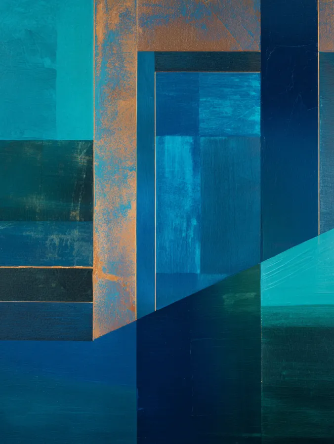 This acrylic painting showcases a bold geometric composition built from layered rectangles and angled shapes. Deep navy, teal, and ocean blue panels stack across the canvas, creating a structured layout that feels sleek and architectural. Thin sections of warm metallic copper add contrast and bring a subtle glow to the cooler tones. The brush strokes are smooth yet visible, giving the color blocks a soft texture that keeps the design feeling hand painted rather than flat. The arrangement of vertical panels and diagonal cuts adds visual movement while still keeping the overall look clean and modern.
