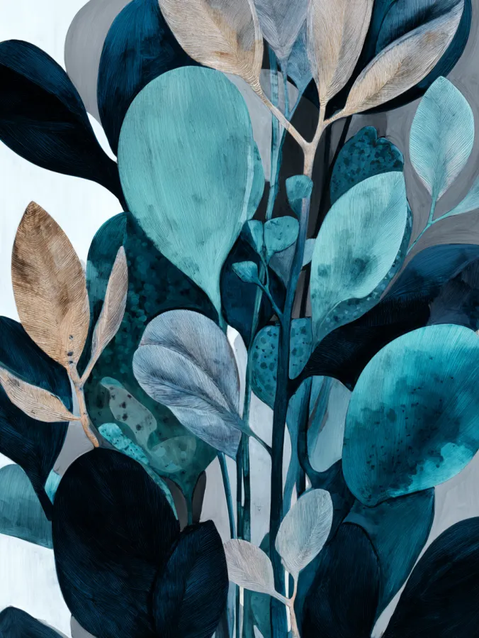 This acrylic painting features a layered arrangement of modern botanical leaves rising gently across the canvas. Soft teal, deep navy, and muted turquoise dominate the palette, while touches of warm beige and pale gray add balance. Each leaf has delicate texture lines that give the shapes a graceful, natural feel. Some leaves are smooth and bold while others have subtle speckled patterns that add depth. The leaves overlap slightly and stretch upward, creating a tall, elegant composition that feels calm and refined against the light neutral background.