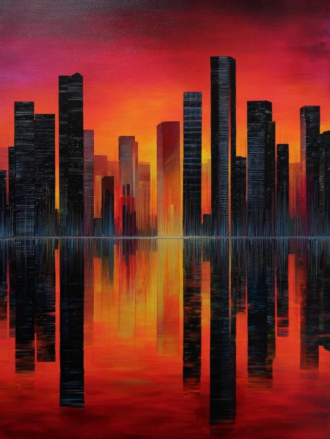 This acrylic painting captures a striking city skyline standing tall against a glowing sunset sky. The buildings appear as sleek dark silhouettes with subtle highlights that suggest windows and reflections. Behind them, rich layers of fiery orange, crimson, and golden yellow blend across the sky, creating a dramatic evening glow. The colors mirror beautifully in the water below, where the reflection stretches downward in soft vertical streaks of red and orange. The composition feels balanced and modern, with the tall towers forming a strong line across the horizon while the glowing reflection adds depth and atmosphere.