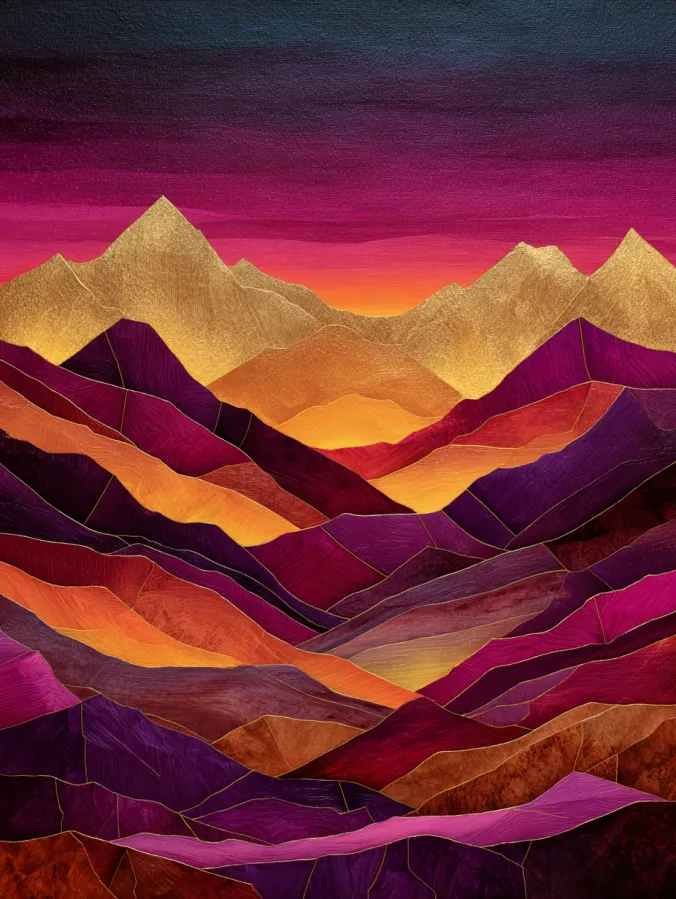 This acrylic painting shows a stunning landscape of layered mountains stretching across the canvas in rich sunset tones. The distant peaks glow in soft gold, while the closer mountain layers shift through shades of plum, magenta, crimson, and burnt orange. Thin golden lines trace along the ridges and valleys, giving the whole scene a refined and modern feel. Each mountain layer overlaps the next, creating depth and movement as the colors gradually change toward the glowing horizon. The sky above blends from deep violet to warm amber, which makes the golden peaks shine even brighter.