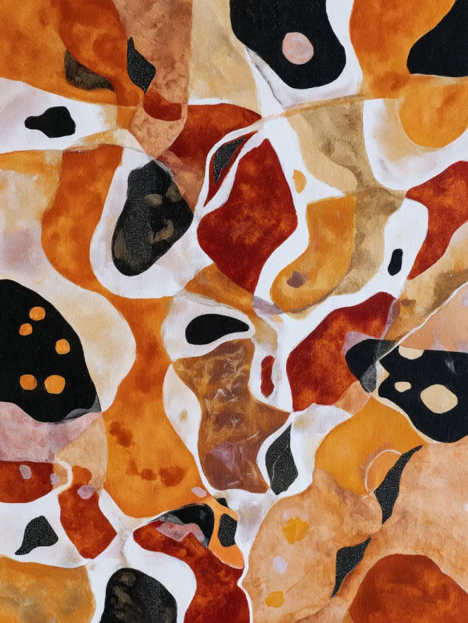 This acrylic painting features a playful terrazzo style pattern made of irregular organic shapes scattered across the canvas. Warm shades of burnt orange, terracotta, caramel, and sandy beige dominate the palette, while bold black accents add contrast and structure. The shapes vary in size and texture, with some areas showing soft watercolor like blends and others appearing more solid and matte. White negative space flows between the forms, helping each color patch stand out while keeping the composition balanced. The overall layout feels modern and stylish, with a relaxed arrangement that still looks polished and intentional.